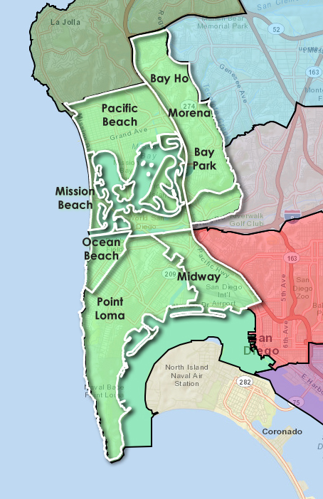Council District 2 covers the communities of Clairemont (West of Tecolote Canyon, including Bay Ho and Bay Park), Morena/Linda Vista, Pacific Beach, Mission Beach, Ocean Beach, Midway, and Point Loma. For a map of District 2, we’ve attached that below.