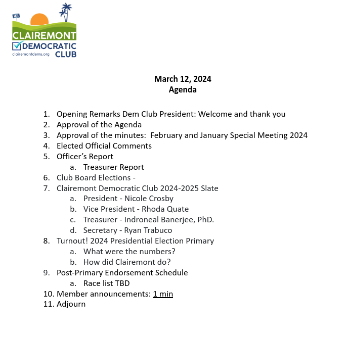 | Hello Clairemont Democratic Club Members, Sadly, we recently lost a dedicated Clairemont Democratic Club member, John Carston. John was a Clairemont resident for decades who was always enhancing his beautiful garden. He leaves behind his family and beloved wife Linda Carston, who served as this Club’s Treasurer for almost a decade. We know that he loved Linda and Linda misses him dearly. Please keep Linda and her family in your thoughts. We will have an opportunity at our general meeting to share memories of John and a moment of silence. If you haven’t yet, please REGISTER HERE! We are voting to elect our next Executive Board to serve you this election cycle – so PLEASE COME VOTE. Look forward to a data driven discussion about: – How our endorsed candidates did. – What area turned out? – How Clairemont did? – What areas can we focus on in preparation for November? Need to pay your dues? Please, join, rejoin, donate and get ready for a year of mobilizing Clairemont Democrats. |