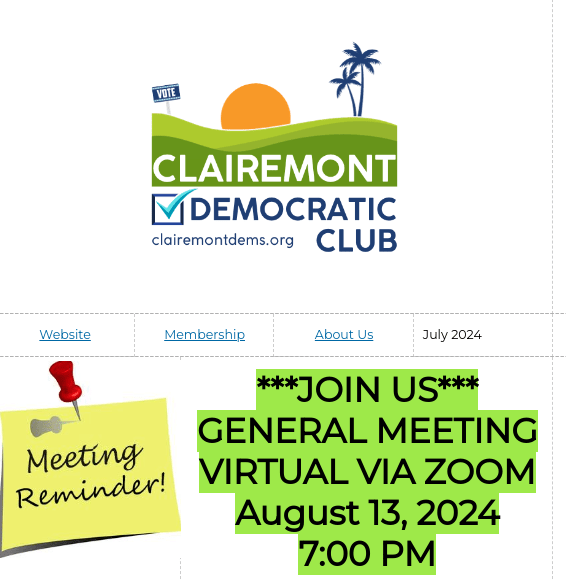 | Hello Clairemont Democratic Club Members, See you Soon!!! We will consider endorsing Vice President Kamala Harris for President 2024 and state ballot proposition recommendations as well as hear about DNC updates. REGISTER HERE! Don’t forget, let us know if you are interested in dropping literature for this election cycle in your neighborhood. We will get you in touch with our GO Team! SAVE THE DATE! Help us table at the Clairemont Family Day, Saturday September 14, 2024 from 9 AM to 4 PM at the South Clairemont Recreation Center. Need to pay your dues? Please, join, rejoin, donate and get ready for a year of mobilizing Clairemont Democrats. Thank you for your continued support to keep the heart of San Diego blue. Sincerely, Nicole & the CDC Board |
